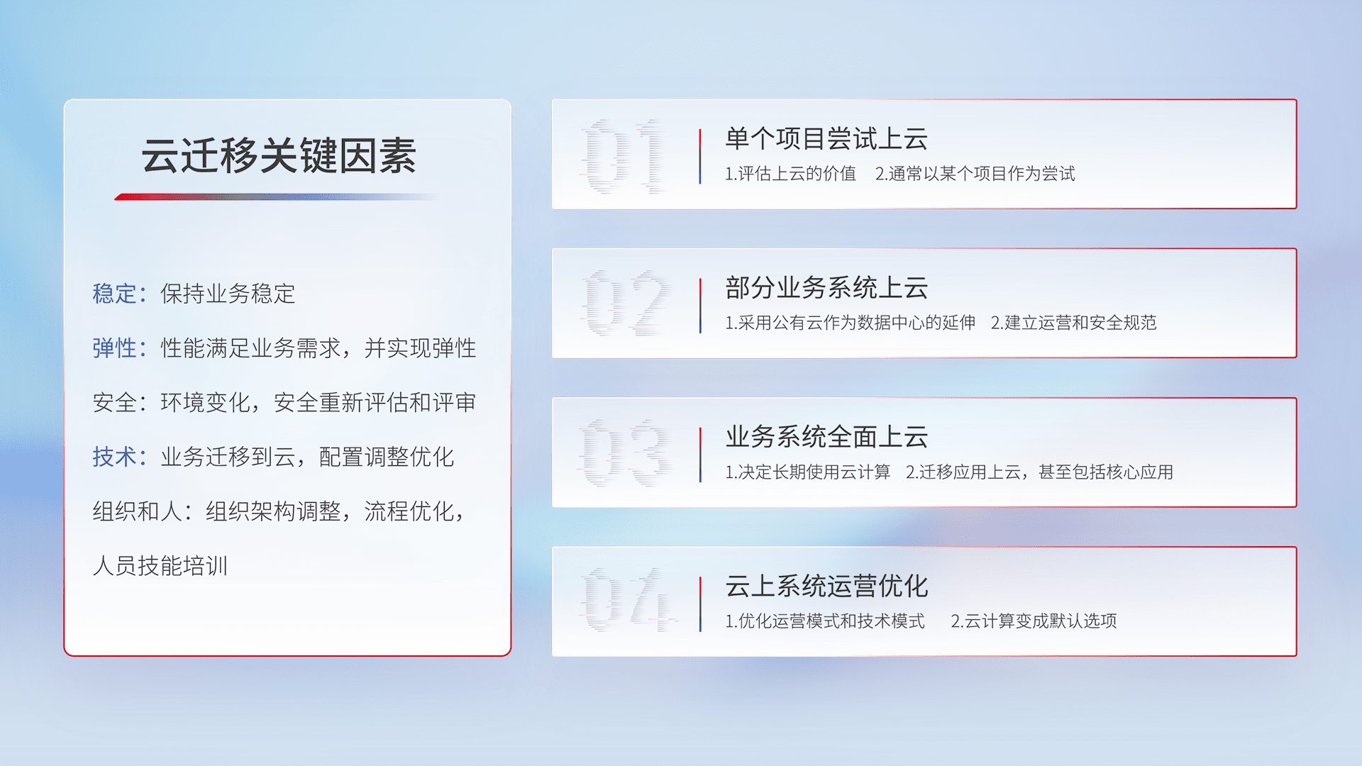 结合实际业务,,,,从规划设计、、、云平台选型、、、、云原生改造、、、、数据迁移、、集成交付,,,迁移全过程为客户识别最佳上云路径,,做好风险识别管理,,,设计网络架构、、、、身份权限、、安全审计合规、、操作审计、、、日志审计、、、监控告警策略、、、多站点容灾设计等,,对云上基础设施进行整体规划,,提升IT治理水平,,以满足弹性、、、高可用、、高性能的需求。。。