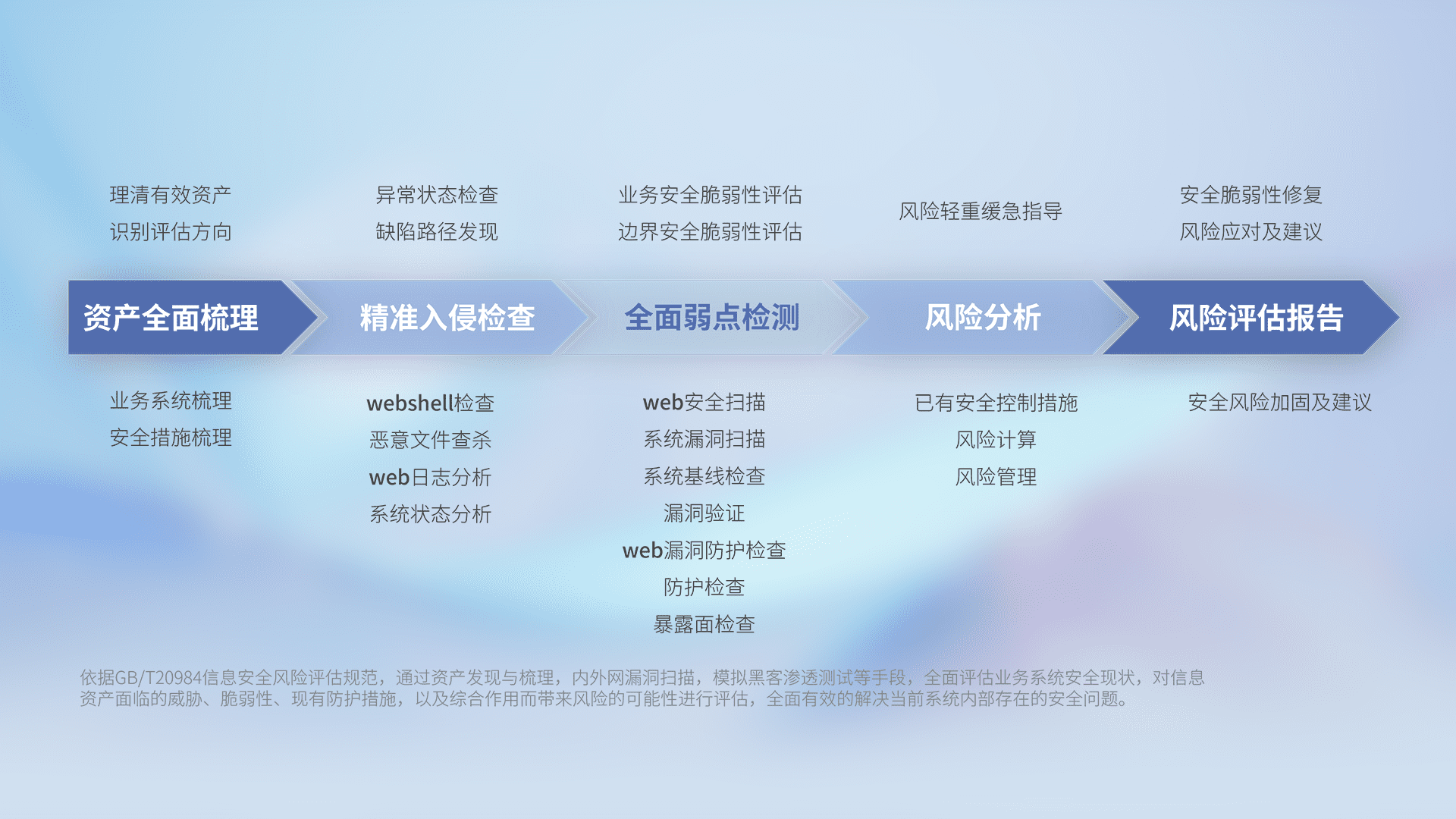 针对客户行业特性,,,以专业的安全服务+多厂商联合解决方案提供专属的一站式安全管理服务,,帮助客户全面感知网络空间威胁,,,,基于识别、、、、检测、、、分析、、、防护、、、监测、、、、响应的服务理论模型,,,从方案咨询、、、集成交付、、、、评估验证、、优化加固、、、、运维运营,,,致力于为客户提供完整的闭环管理式安全服务。。。。以实战经验为客户打造高抵御风险的安全体系,,帮助客户发现威胁、、、、对抗威胁、、、、处置威胁,,不断积累安全对抗能力,,,,持续保障数字化安全。。。